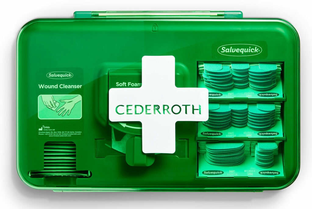 Sårvård Dispenser är ett smart komplement till Första Hjälpen-stationen och placeras där du löper stor risk att få skärsår. Innehåller Soft Foam Bandage Blue ett självhäftande, limfritt plåster som sitter kvar även i vatten. Dispensern innehåller även Sårtvättare samt en större mängd plåster i olika storlekar. Innehållet hålls fräscht bakom den dammskyddande luckan. Fylls på med hjälp av den medföljande refillnyckeln.