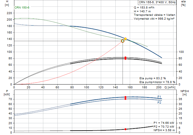 Resulterande lyfthöjd för pumpen 133,8 m
